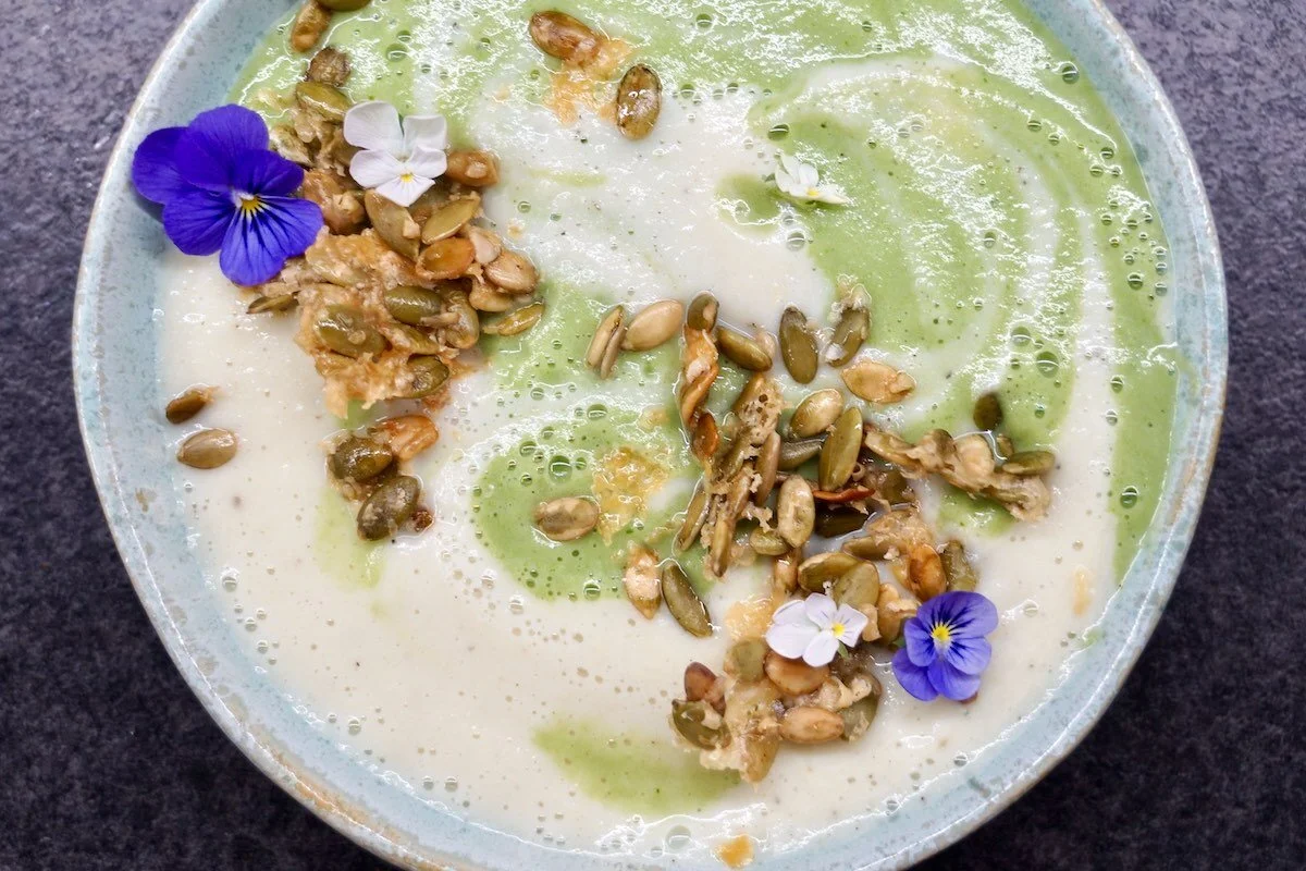 Keittojen suurustukseen käytetään usein jotain jauhoa, mutta tässä keitossa kermaisuudesta huolehtivat täysmaito ja peruna. Uskoisin, että maidon voisi hyvin korvata esim. Aito Barista (Fazer) kauramaidolla, jos keitosta haluaisi vegaanisen. En kyllä korvaisi parmesaania millään vegaanisella muka-parmesaanilla. Mieluummin yksinkertaisesti paahtaisin siemenet pannulla tai vaihtoehtoisesti paahtaisin krutongit öljyn kera.