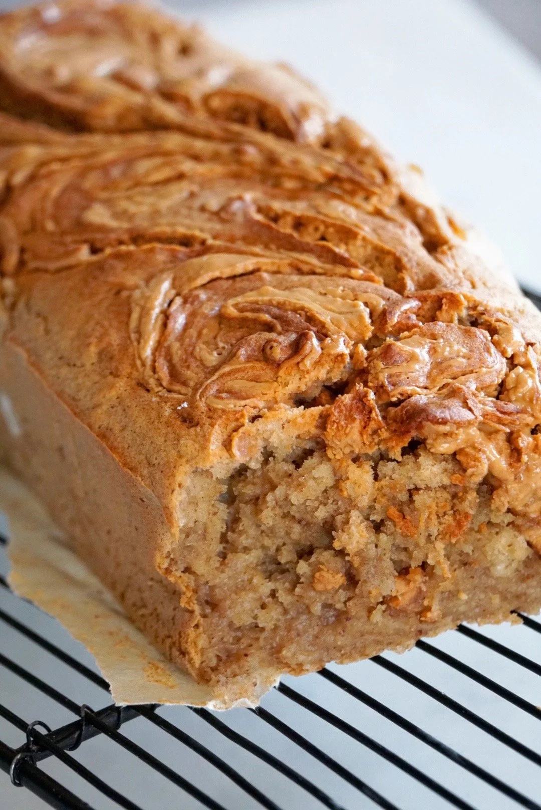 Kaada puolet seoksesta leipävuokaan. Lusikoi päälle pituussuunnassa pötkö maapähkinävoita. Kaada loput taikinasta sen päälle ja lusikoi vielä pinnalle maapähkinävoita ja voit tehdä pintaan kierrekuvioita esim. puutikulla pyöritellen.