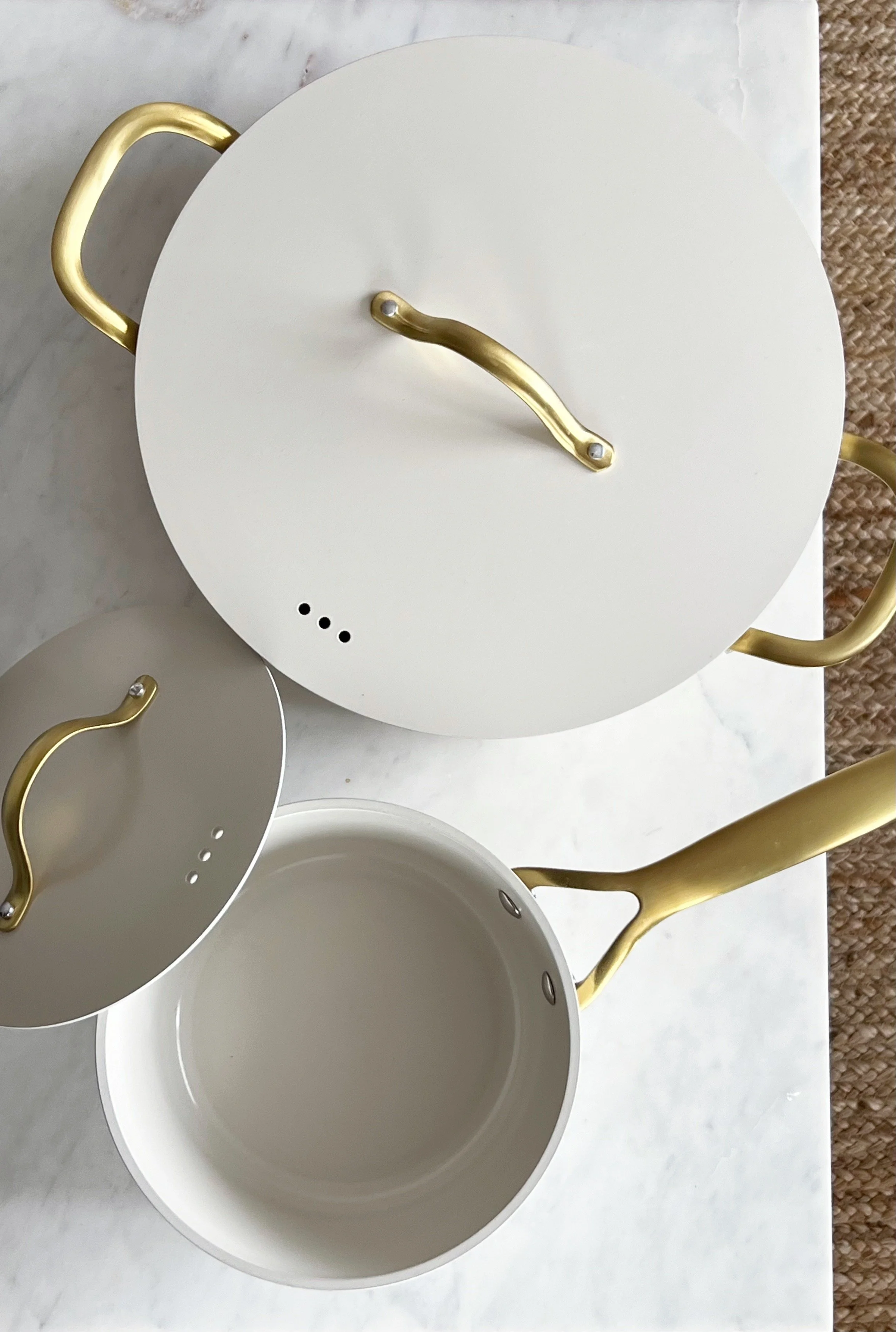 Royal Pearl -sarjan paistinpannut ja kasarit on valmistettu 100 % kierrätetystä alumiinista ja ne ovat 100 % PFAS-vapaita ja myrkyttömiä. Erinomaisia siis terveelliseen ruoanlaittoon. Sarjan tuotteet sopivat kaikille liesille, myös induktiolle, sekä uuniin (max 220 °C). Pehmeä kermanvaalea sävy ja upeat mattakultaiset kahvat tekevät niistä tyylikkäät. Erityisesti olen pitänyt ison kannellisen paistokasarin (ø28cm)* käytöstä, sillä voin paistaa siinä aineksia ja sitten nostaa ne samassa padassa suoraan uuniin. Näin kertyy vähemmän tiskiä. Myös kannellinen kasari (2L)* on aktiivikäytössä saapumisestaan lähtien.